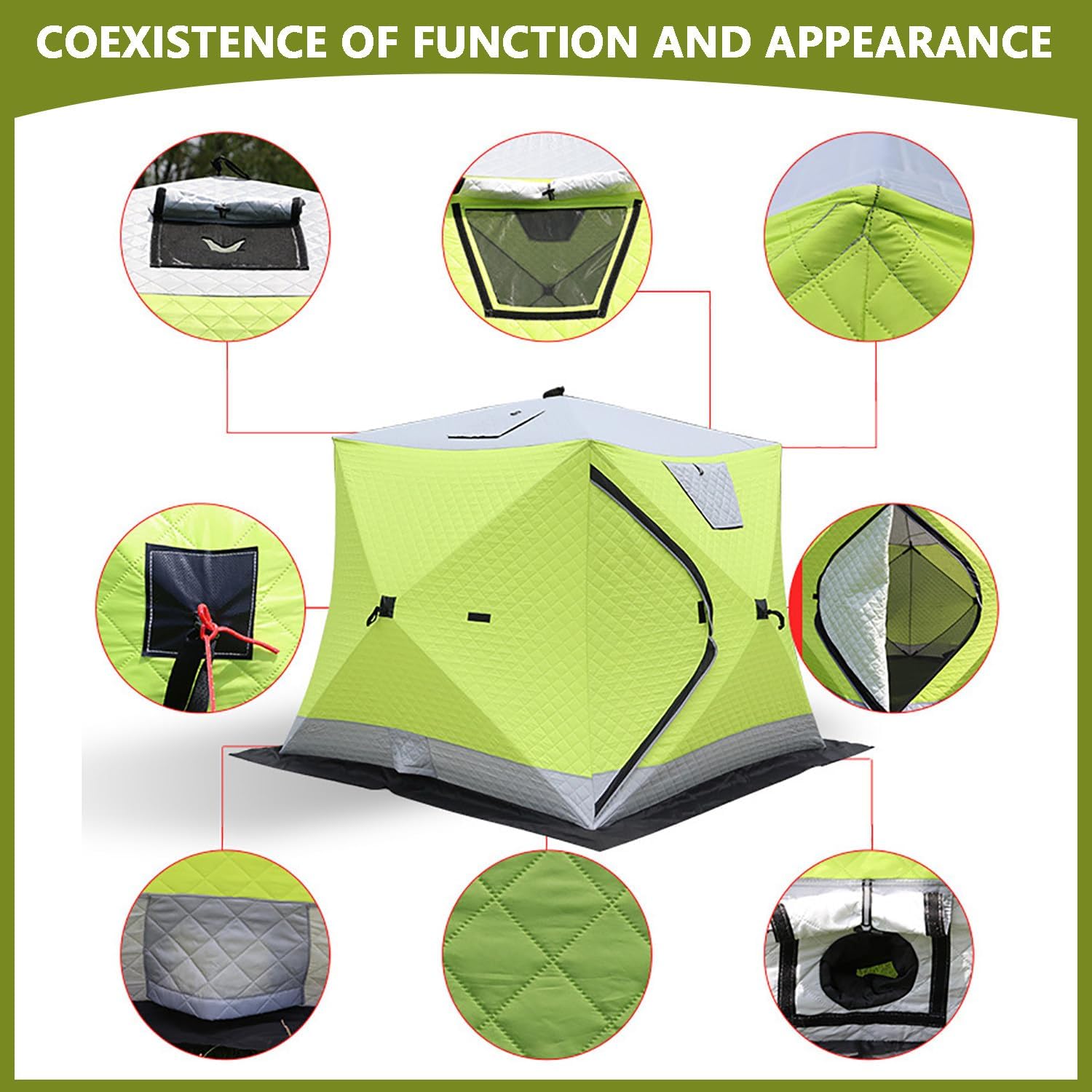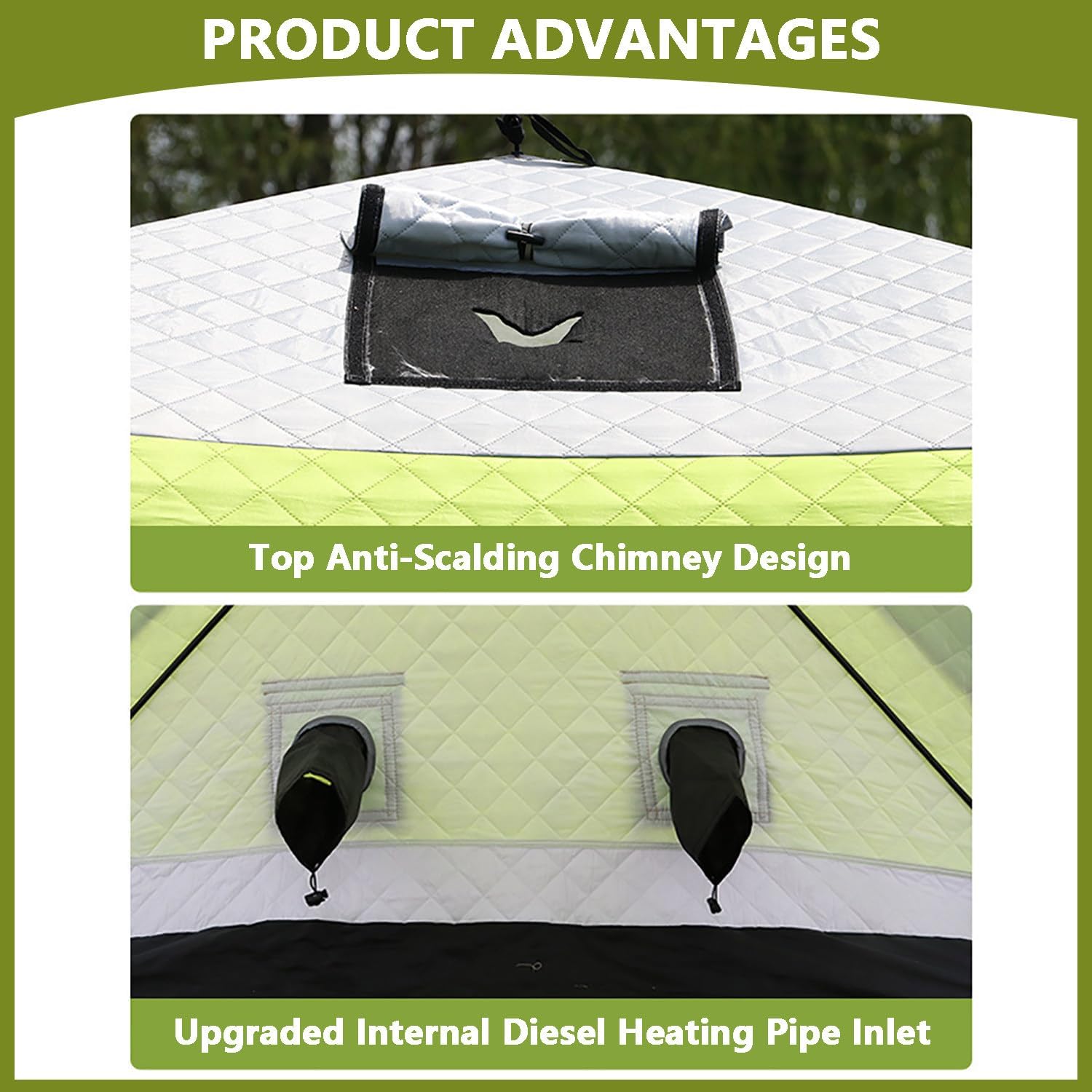 Product DescriptionExperience comfort, warmth, and reliability on the ice with this upgraded insulated ice fishing tent, designed for anglers, campers, and winter explorers. It comfortably accommodates 4–5 people, making it ideal for group fishing trips or multi-day outdoor stays.Constructed with dual-layer 210D Oxford fabric and a high-density insulation layer, the tent maintains stable interior warmth while resisting wind, snow, and moisture. The solid fiberglass support frame provides excellent structural stability without adding unnecessary weight, allowing easy transport even in extreme winter conditions.⚠️Please note: This tent is not waterproof. Please do not use it in the rain. It is suitable for use in snowy weather.Product Parameters:Model: 2117 Ice Fishing Tent(Upgraded Chimney)(4-5 person)Product Configuration: Sngle doors, 2 windows, 1 ventilation holes; 1 top chimney openingOuter +Inner Fabric: 210D Oxford clothMiddle Cotton Layer: 120g needle-punched cottonFrame: 11mm solid fiberglass tubeChimney Opening Material: Aramid fiber Colors: Unfolded Dimensions: 210 × 210 × 190 cmFolded Dimensions: 140 × 30 × 28 cm / 55.12 × 11.81 × 11.02 inch.Net Weight: 10.5kg, Gross Weight: 11.6kg Accessories: Packaging bag *1, ice spikes *4, windproof ropes *4, TPU window film*2, Ice fishing Mat *1, instruction manual *1