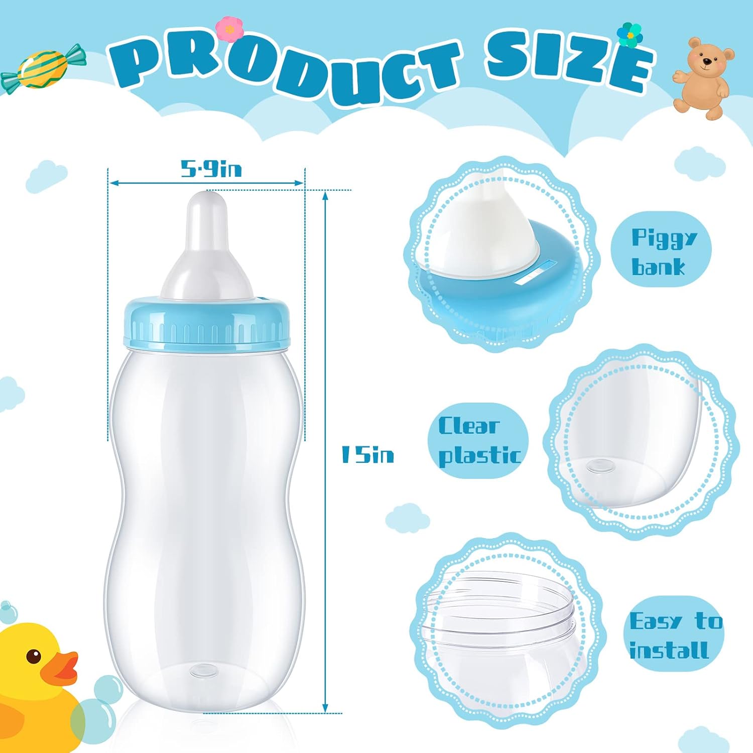 Features: Reliable to use: This jumbo baby bottle bank is made of quality material, which is reliable to use, sturdy and firm, not easy to deform and break, can be applied for a long time. Nice gift: Giant baby bottle piggy bank looks cute and attractive, can be good gift choice to send to your family members, friends, relatives and more, they will feel your thoughtfulness. Specifications: Material: plastic Color: as pictures show Size: 38 x 15 cm/ 15 x 6 inches Package includes: 2 x Baby bottle banks Notes: Manual measurement, please allow slight errors on size. The color may exist a slight difference due to different screen displays